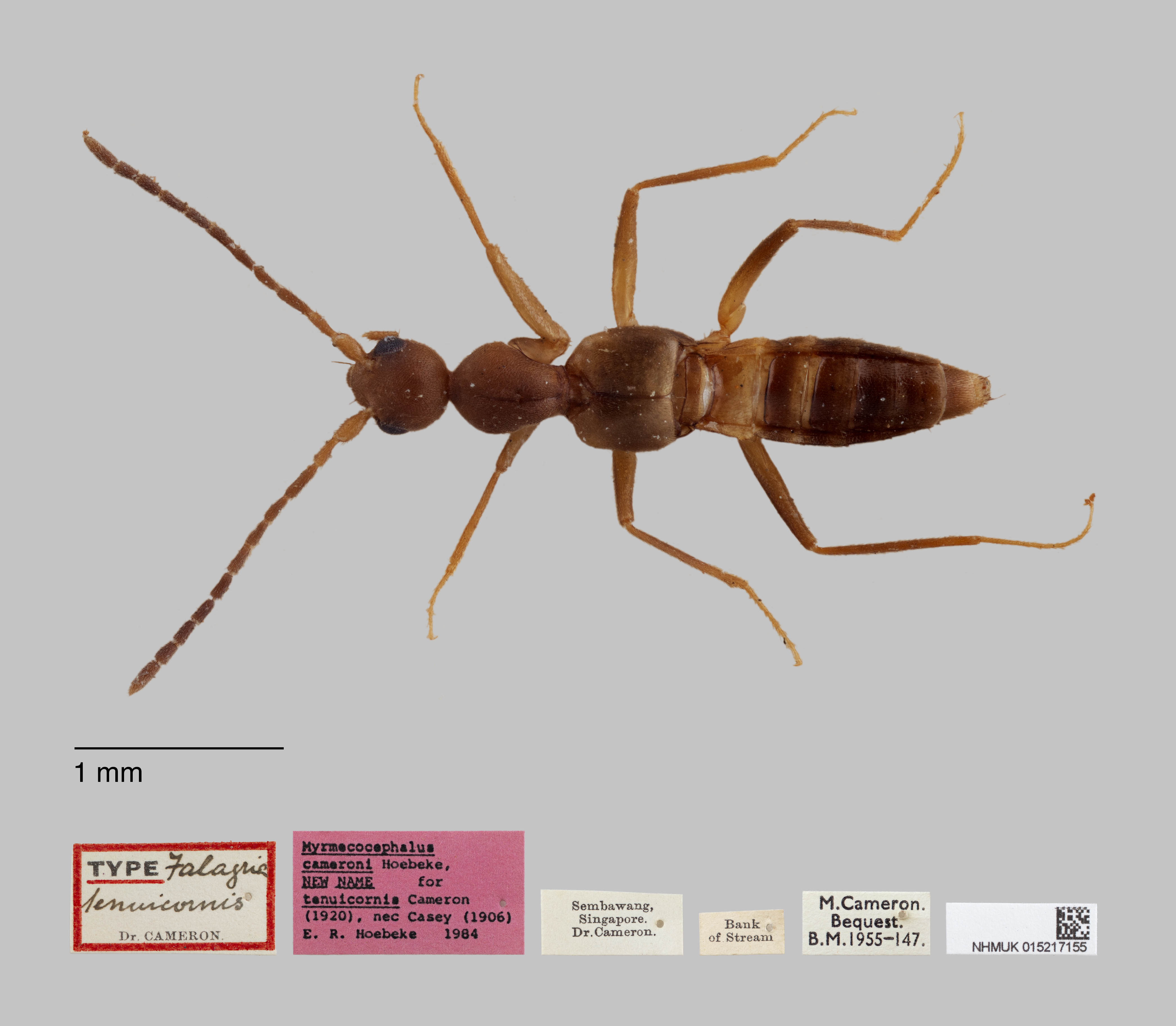 Myrmecocephalus cameroni Hoebeke, 1985 is a replacment name for Falagria tenuicornis Cameron, 1920
